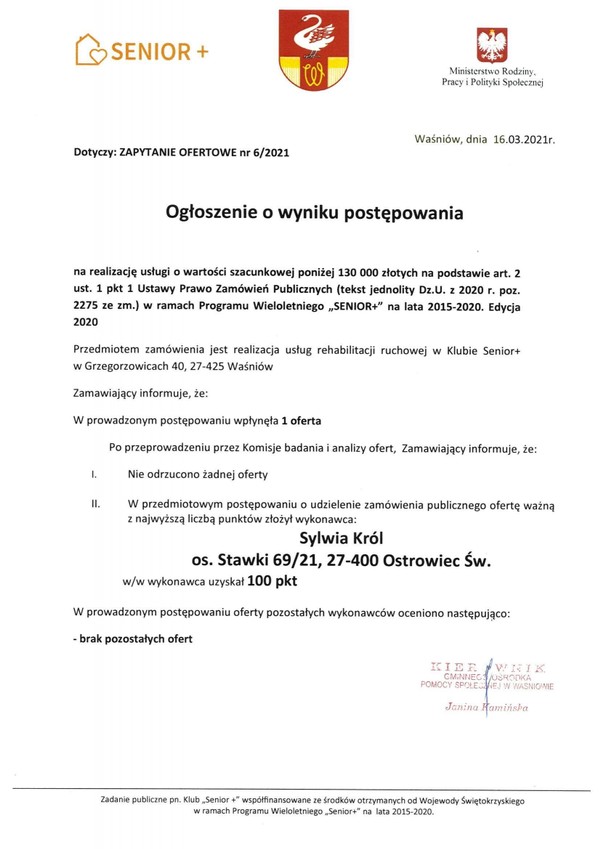 Ogłoszenie o wyniku postępowania - ZAPYTANIE OFERTOWE nr 6/2021 - realizacja usług rehabilitacji ruchowej w Klubie Senior+ w Grzegorzowicach