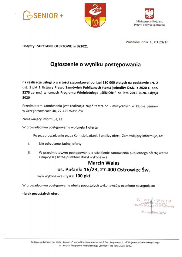 Ogłoszenie o wyniku postępowania - ZAPYTANIE OFERTOWE nr 3/2021 - realizacja świadczenia zajęć teatralno - muzycznych w Klubie Senior + w Grzegorzowicach